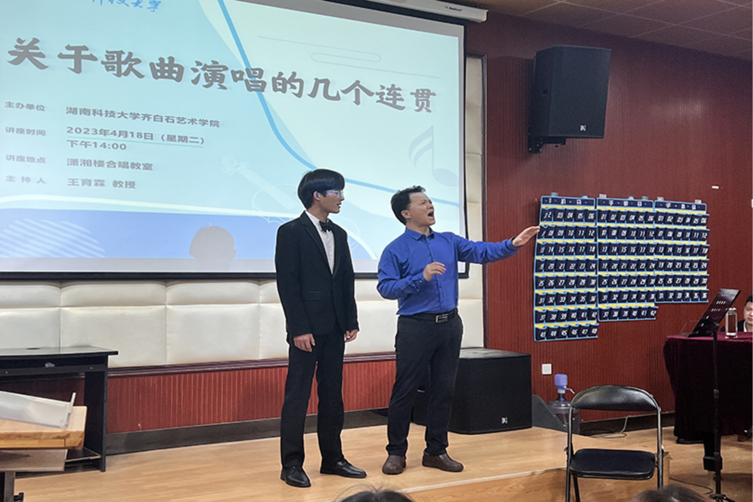 为进一步提升无码影片音乐系声乐教学质量,提高学生声乐演唱水平,4月18日下午,无码影片特别邀请到了马关辉教授在音乐系合唱教室开展主题为《关于歌曲演唱的几个连贯》的专题讲座,由无码影片副院长王育霖教授主持本次讲座。讲座以声乐公开课的形式开展,音乐系师生与会参加。
